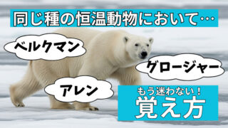 まとめて覚える!【同じ種の恒温動物において…】ベルクマン、アレン、グロージャーの法則の覚え方! 概要 ベルクマンの法則、アレンの法則、グロージャーの法則は、同じ種の恒温動物が環境に適応して形態が変化する傾向を示す生態学の法則です。 競技クイズでは頻出分野でありながら聞き分けが難しいため、3つの法則を正確に区別して覚えるこ...2025.11.11まとめて覚える!クイズの勉強
